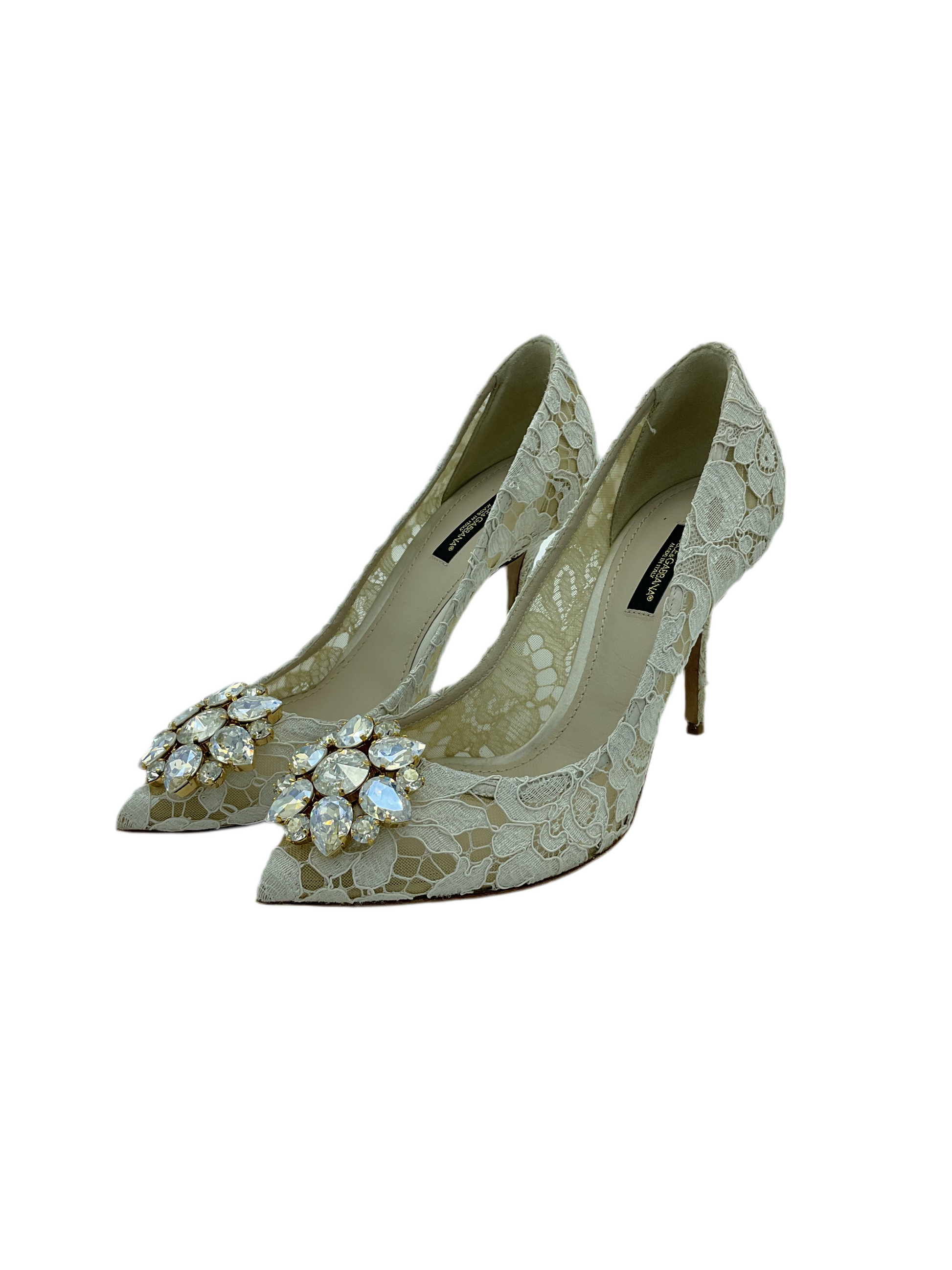 Tacones de encaje blanco y detalle de pedrería en la parte frontal Dolce Gabanna talla 38 Eur, 5M Méx. Tacones de 10 cm. Excelentes condiciones. Full set.